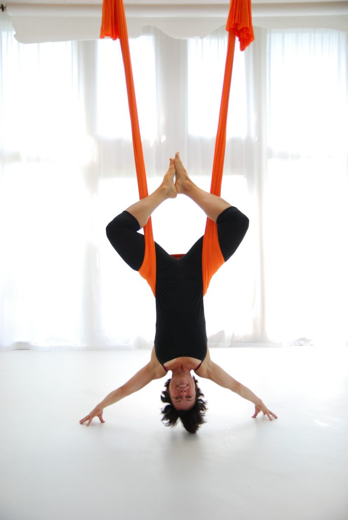 Die Besonderheit im Aerial Yoga sind die sogenannten „Umkehrhaltungen“. Du kannst hier ohne Mühe, quasi schwerelos deinen Körper kopfüber hängen lassen. Der ganze Körper und alle Organe erfahren ein ganz neue Dimension. Dabei löst sich so manche alte Verspannung und Blockade – ein befreiendes Gefühl für Körper und Seele.